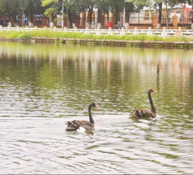 学校荟萃湖新景:一对黑天鹅的优雅邂逅