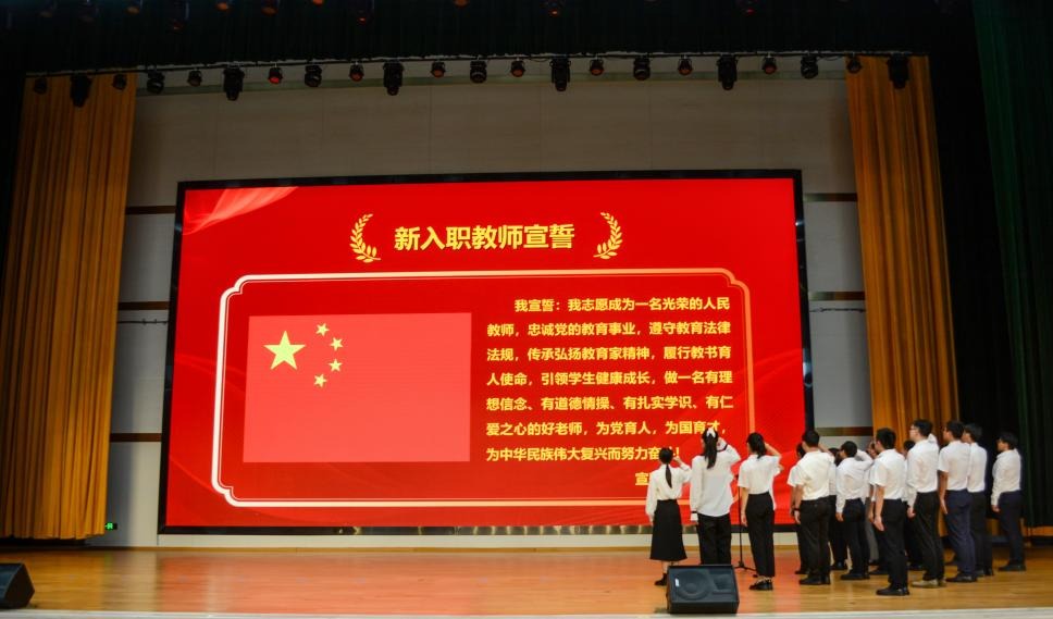大会在庄严的奏唱国歌仪式中拉开帷幕。随后,学校2024年、2025年新入职教师在优秀教师代表伍懿美老师的带领下进行庄严宣誓。
