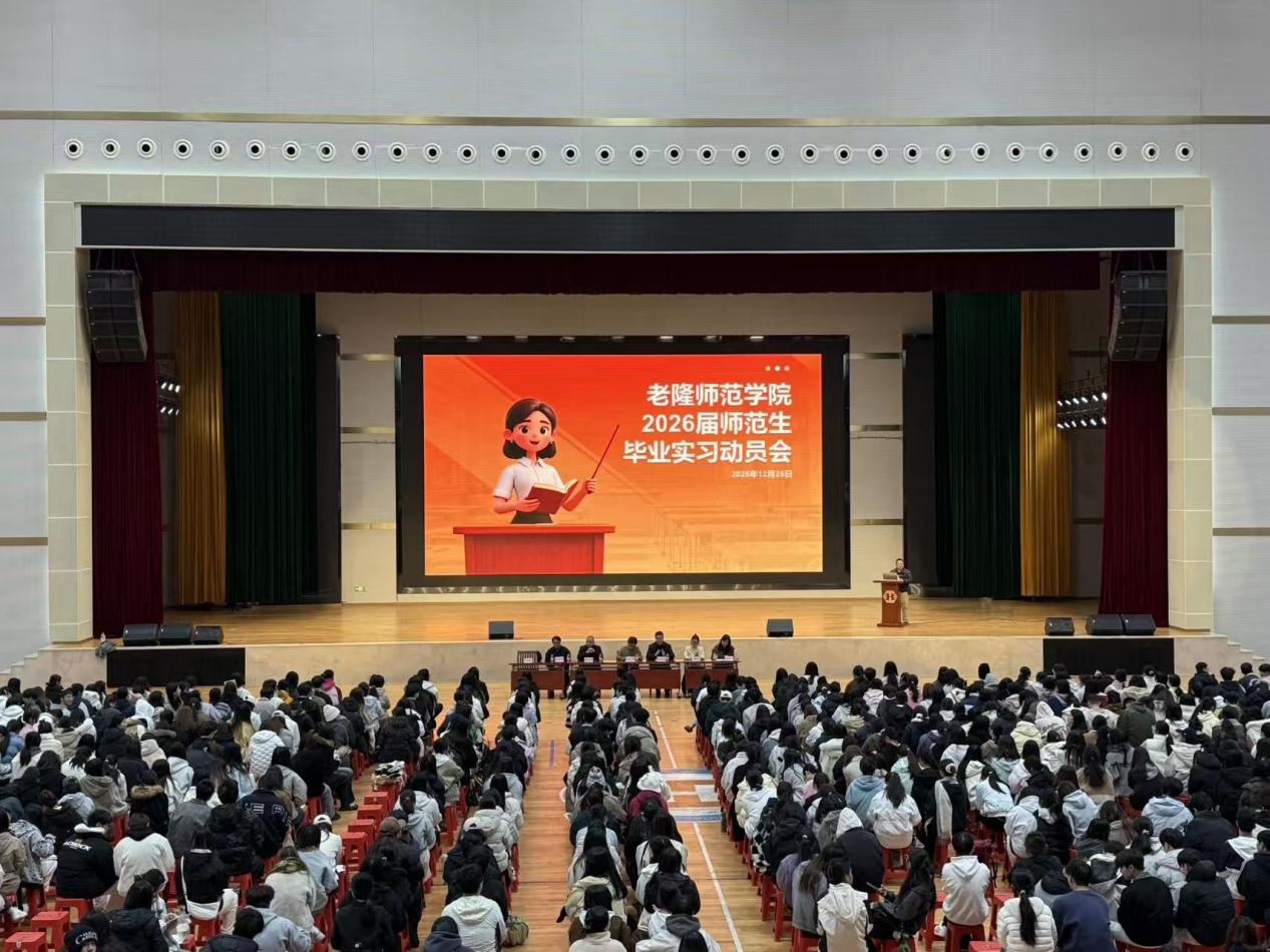 2025年12月25日下午,老隆师范学院2026届师范生毕业实习动员大会在学校体育馆隆重召开。姚家芳副校长、学院领导班子成员、全体毕业班班主任、指导老师及2026届师范专业毕业生参加了此次动员会。本次动员会由李雄副院长主持。