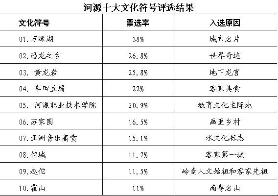 大学生评选出的河源十大文化符号具有丰富的历史文化内涵和显著的地域性标志,其中既有历史古迹、人文景观,又有现代文明的标志,但旅游景区占了多半,反映出旅游业的兴旺对城市形象和文化软实力的重要推介作用。