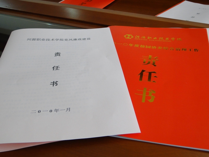 据了解,此次签订仪式签订了各部门2010年度的工作责任书、党风廉政责任书、计划生育责任书和综合治理责任书。学校旨在通过签订责任书,让各部门明确工作职责、把握总体工作思路,同时强化问责意识、提高工作效率。