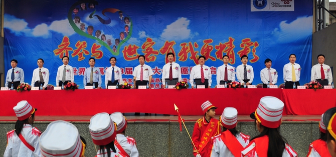 3月2日上午,世客会组委会、团市委、市志愿者联合会联合开展的“齐参与,世客有我更精彩”世客会志愿服务启动仪式老城中山公园举行,市委书记陈建华、市委常委、副市长杨耀初等领导出席启动仪式。我校1000名志愿者齐聚公园参加此次活动。仪式由市委常委、宣传部部长吴善平主持。