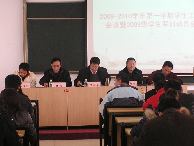 1月13日下午,我校本学期第四次学生工作会议暨2009级学生军训动员会在教学楼C201召开,陈农心副校长和学生工作队伍全体人员参加了会议。会议由学工处负责人主持。