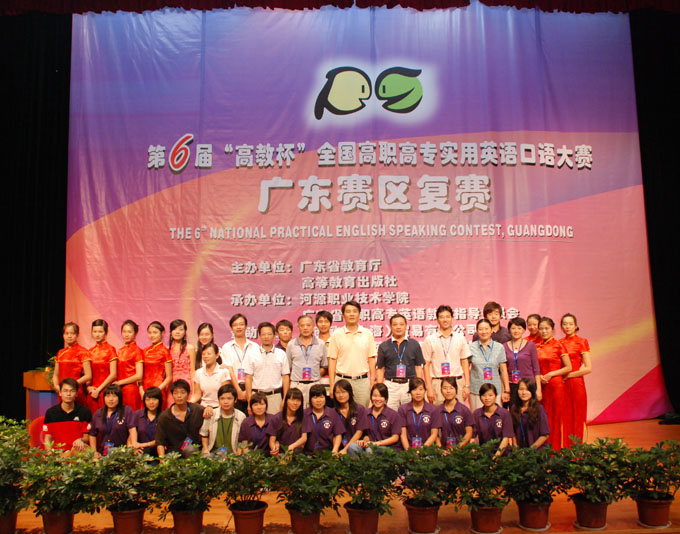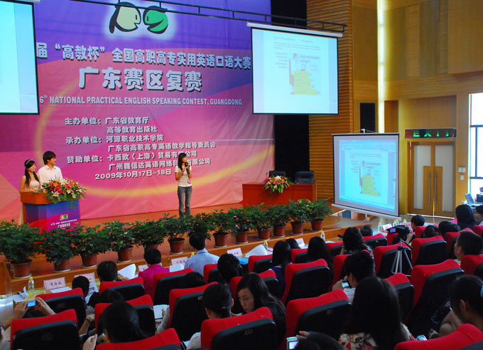 10月17-18日,第六届“高教杯”全国高职高专实用英语口语大赛(广东赛区复赛)在我校举行,来自全省48所高职高专院校的88名选手参加了比赛,2名选手晋级全国总决赛。
