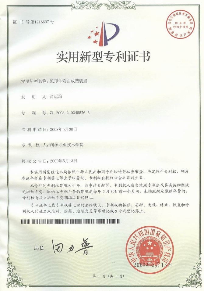 截至今年8月份,我校已完成国家专利申请14项,其中包括:发明专利3项,实用新型专利10项,外观设计专利1项。肖运海和于景福老师独立申请的三项实用新型专利已获得国家专利授权证书;戴卫军、葛建新、杨 伟、钟明鑫、陈纪钦、张海乾、王 晖、黄 雷、陈 余、李大成、崔华安等11位老师联合申请的五项实用新型专利收到国家专利授权通知;刘安华校长独立申请的发明专利已通过公示期,进入答辩阶段。这些成绩的取得不仅是以上各位老师们心血的凝聚,更是学校领导重视、全体师生支持和共同努力的真实体现。主要表现如下: