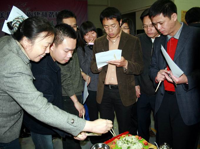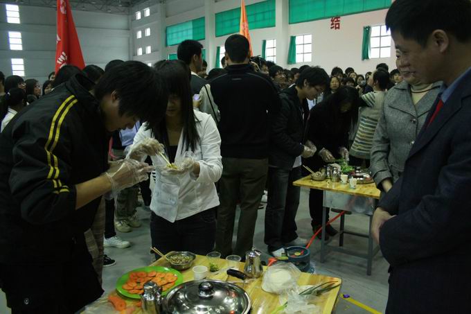开幕式上,来自我校的9支以女生为代表的参赛队伍进行了限时30分钟的包饺子厨艺大比拼。各队在比赛上纷纷拿出自己的绝活,随着比赛热情的高涨,在比赛期间,穿插着各种有趣、变化多样的有奖问答活动,现场霎时成为一片欢庆的海洋。经过紧张的比拼,九号参赛队伍最终凭借其独特的造型,美味口感的“牛气冲天”,争夺此次比赛冠军。