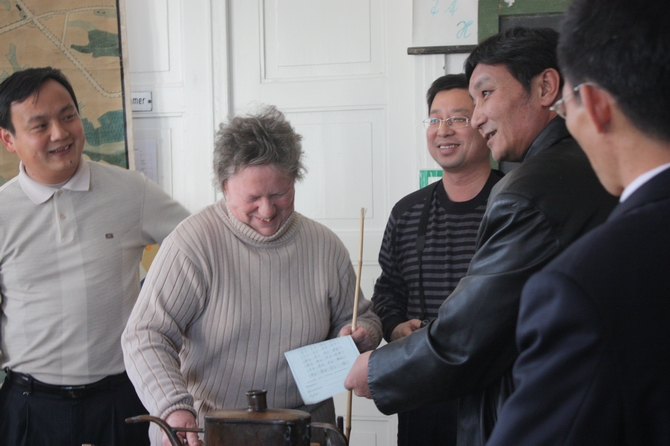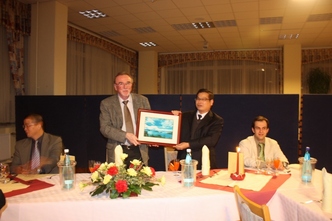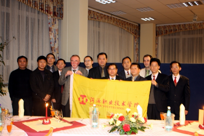 当晚,Dr Volkman Meinhold为考察团全体学员举行欢迎晚宴并发表了热情洋溢的讲话,他希望两校能以此次考察学习作为两校合作的良好开端,积极推动两校的职业教育学术交流和职业培训工作,我校考察团向德方赠送了礼品和校旗,同时对德方的热情款待表示感谢。