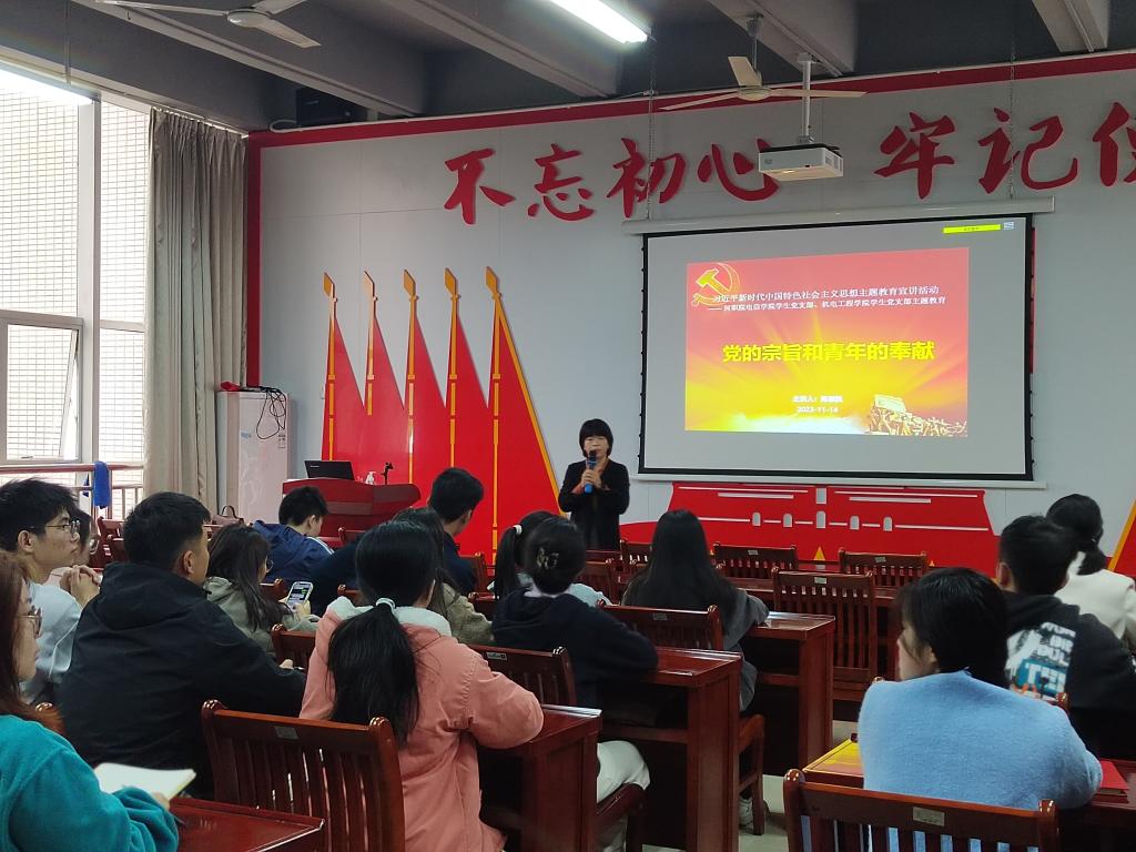 为抓实抓细学生党员主题教育,加强学生党员的思想建设和对党的深入学习了解,电信学院学生党支部于11月14日下午在实训楼B306开展了“以党的宗旨和青年的奉献”为主题的专题党课讲座,由学校“学习贯彻习近平新时代中国特色社会主义思想主题教育宣讲团”成员陈慧枫副教授主讲。