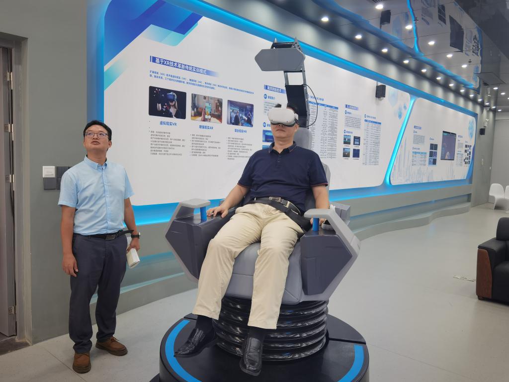 会后,在工贸职院信息中心副主任卢志海等人员的陪同下,杨文一行参观了该校国家级虚拟仿真实训基地,并体验虚拟仿真设备与资源。