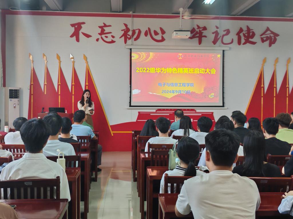 9月10日下午,电子与信息工程学院22级华为特色精英班启动会在实A306举行。学院王富宽院长、周永福副院长、校企办叶红卫主任,广州腾科网络技术有限公司培训部罗文迪经理,教师代表和精英班全体学生70余人参加活动。