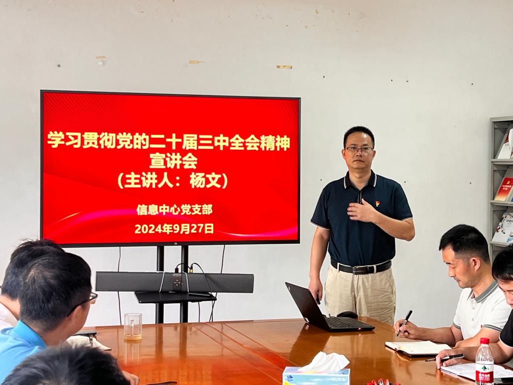 为全面深入学习贯彻党的二十届三中全会精神,切实把思想和行动统一到党中央的决策部署上来,按照学校党委工作部署要求,9月27日下午,信息中心在中心会议室举行学习贯彻党的二十届三中全会精神宣讲会,中心党支部书记杨文同志作专题宣讲。信息中心全体人员参加宣讲会。