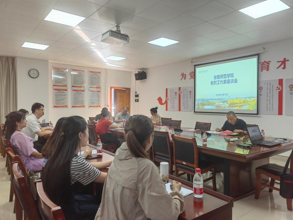 10月17日下午,老隆师范学院在学院会议室召开教职工代表座谈会。此次会议由学院工会主席谢战锋主持,学院领导班子成员、工会委员以及新进教职工代表参加了会议。