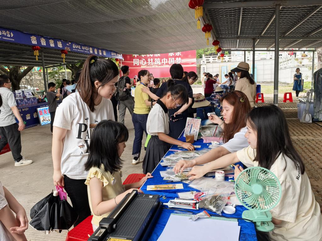 活动现场,学院师生以“科技特派员+非遗创新创业团队”模式,向民众展示了包括蓝染布艺、畲族图腾饰品及“客畲蓝梦”主题服饰等系列文创作品。这些作品结合传统工艺与现代设计,吸引了大量游客驻足体验。师生团队还通过现场教学,向游客演示蓝染技艺、畲绣针法、非遗压花等非遗工艺,让传统技艺“可触可感”,进一步推动了畲族文化从静态保护向活态传承的转变。