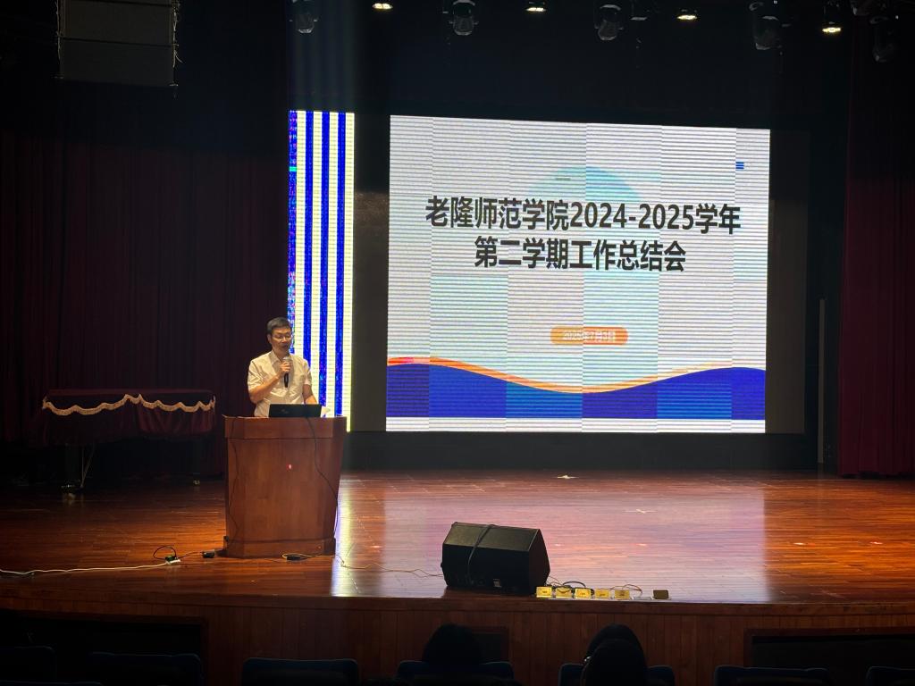 2025年7月3日上午,老隆师范学院在艺术楼演播厅召开2024-2025学年第二学期工作总结会。学院全体教职工共同回顾过去一学年的工作成果,展望未来发展蓝图。