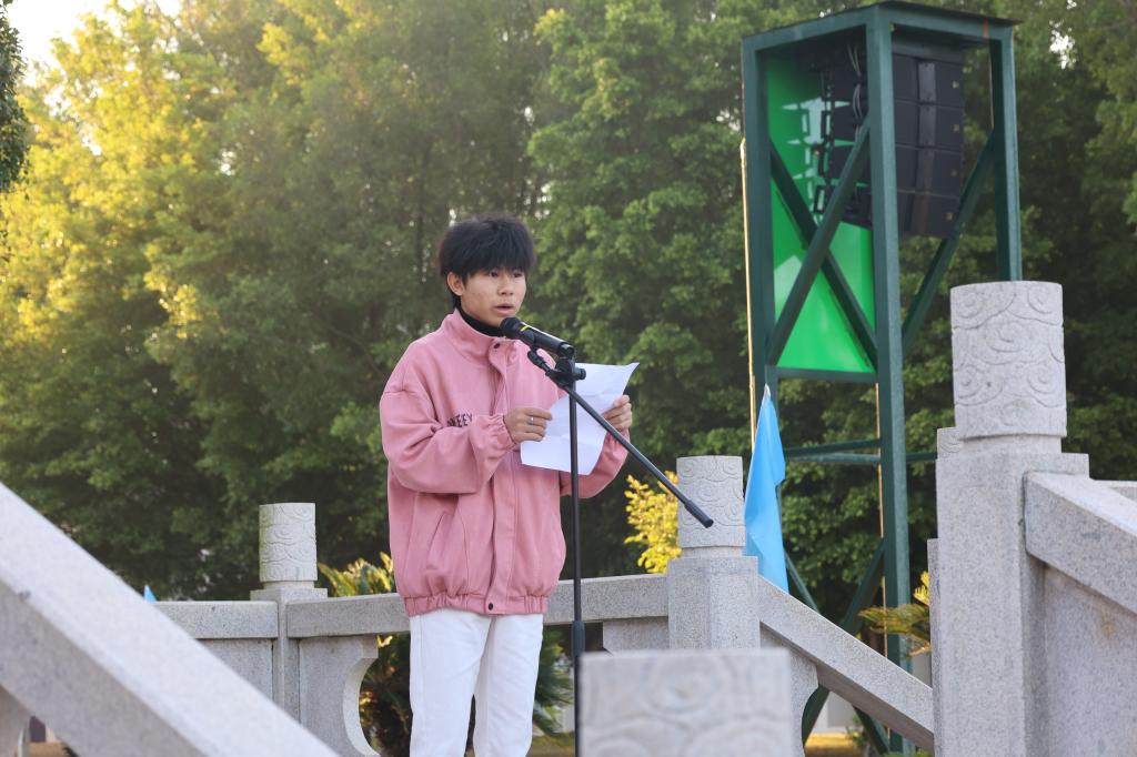 升旗仪式结束,院团委副书记许宗允作为学生代表在国旗下发言,他呼吁同学们从遵守课堂纪律、认真完成作业、专注听讲做起,以实际行动涵养优良学风,珍惜青春时光,不负师长期望,在勤学善思中锤炼本领,让奋斗成为青春最亮丽的底色。