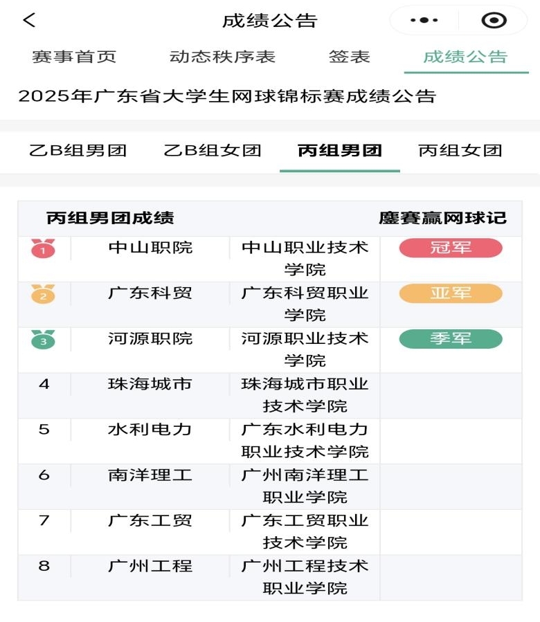 11月28日,2025年广东省大学生网球锦标赛在中山市真珠网球中心圆满落幕。我校网球代表队在比赛中团结一心,奋勇拼搏,最终斩获丙组(团体总分)一等奖(总排名第六)以及男子团体项目第三名的优异成绩。