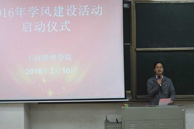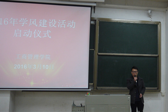 3月10日16:20,我院于教学楼D108教室开展2016年学风建设系列活动启动仪式。我院院长俞彤,副院长邓文博,全体辅导员以及学院班子成员与各班班干部参与了此仪式。