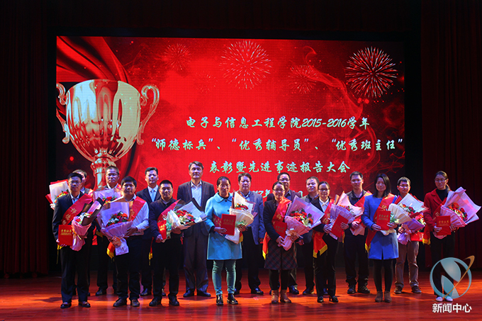 2017年1月3日下午,电信学院2015-2016学年“师德标兵”、“优秀辅导员”、“优秀班主任”表彰暨先进事迹报告大会在艺术楼演播厅召开。陈德清校长、陈农心副校长、电信学院领导及全体教职工、各专业学生代表出席本次大会,大会由学院党总支副书记徐国辉主持。