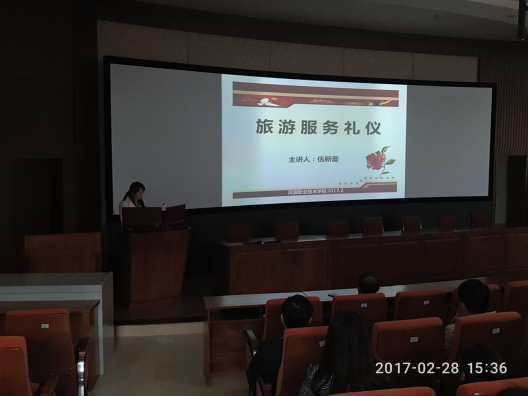 最后,学院安排旅游管理专业教师伍新蕾以“旅游服务礼仪”课程为例对全体教师进行了说课培训与示范。
