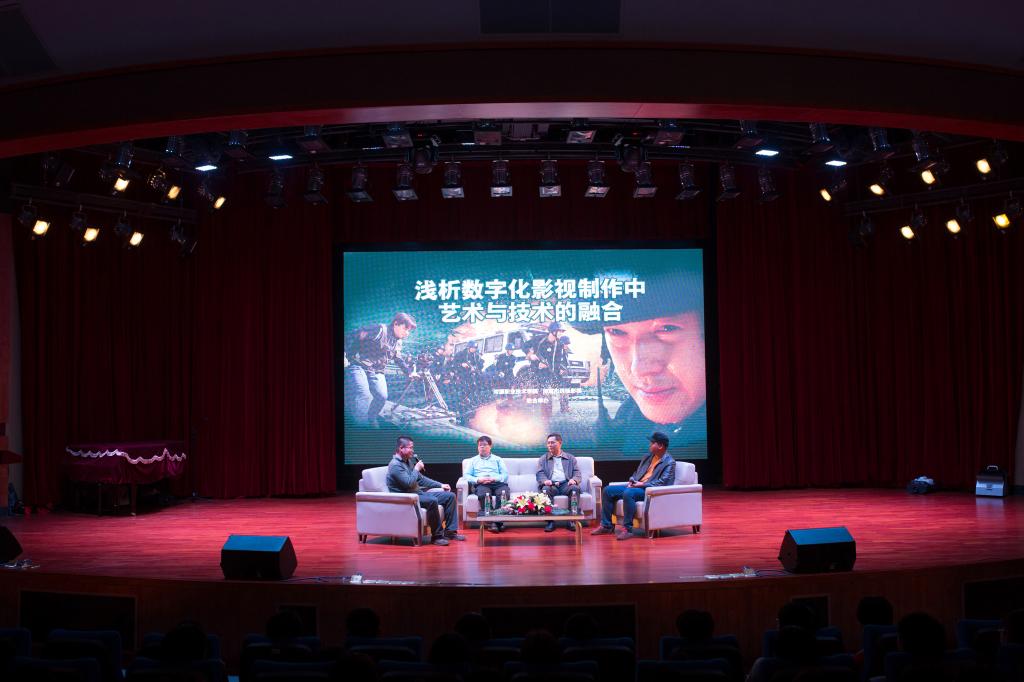 随后进行的是由古水桂先生、李豪先生、叶泉导演以及王亮老师四位嘉宾组成的影视论坛。在影视论坛中,嘉宾们一起系统地探讨了影视创作市场现状与发展前景、团队组建与建设的经验、影视创作中创意设计与来源、影视创作中拍摄技术、后期制作技术、审美能力快速提升方法与技巧、影视创中如何承载文化、如何传递社会正能量等影视创作中艺术与技术融合的关键问题。讲座现场,台上的嘉宾与同学们就上述问题进行了交流,并对同学们提出的影视创作的问题进行了一一解答与专业引导。