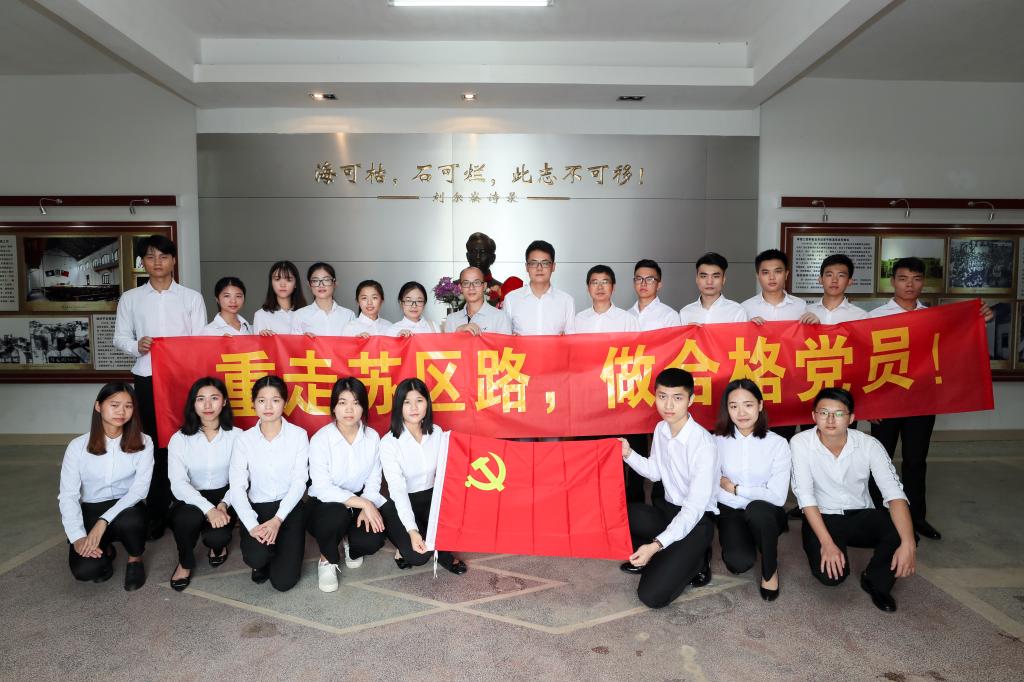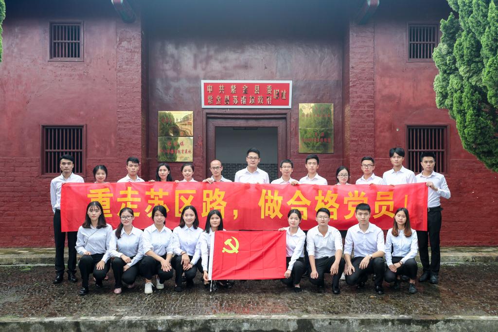 下午14点30分,全体同志来到紫金县苏区镇革命旧址参观、学习。大家参观了紫金苏维埃政府旧址、苏区革命烈士纪念堂、“血田”革命烈士浮雕等革命遗址。大家怀着对革命先烈的无比崇敬与缅怀之情,肃穆列队,在血田纪念碑前重温了入党誓词。在苏区革命烈士纪念堂,全体师生党员还一起学习苏区红色文化、齐唱国际歌,师生们洋溢着爱国热忱。