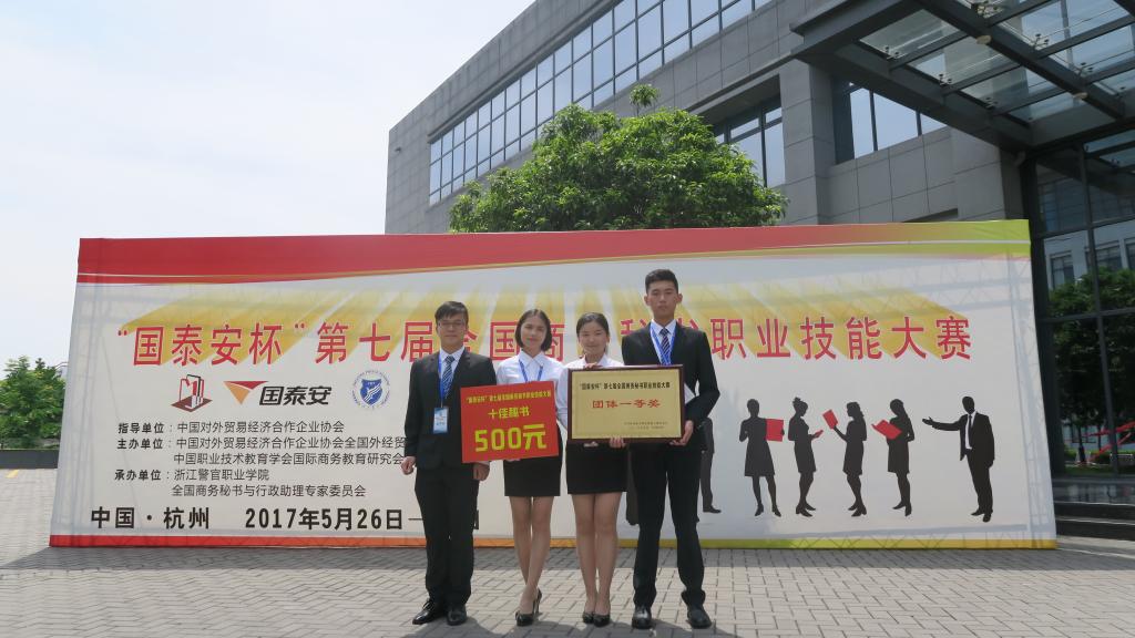 5月28日,“国泰安”杯第七届全国商务秘书职业技能大赛在浙江警官职业学院落下帷幕,我校文秘参赛队在比赛中沉着应对,经过激烈的比拼,荣获团体一等奖,其中杨婷婷同学还获得“十佳秘书”荣誉称号。