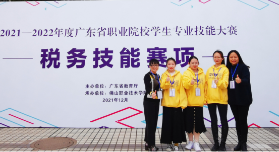 2021年12月25日,2021-2022年度广东省职业院校学生专业技能大赛“税务技能”赛项在佛山职业技术学院举行。我校大数据与会计专业学生温明慧、叶晓珊、林紫怡以及姜庆、张森芳两位指导老师组队参加比赛。我校代表队在全省58支参赛队伍中排名第二(第一名为东道主佛山职业技术学院代表队),荣获一等奖,我校连续两年获得该赛项一等奖。